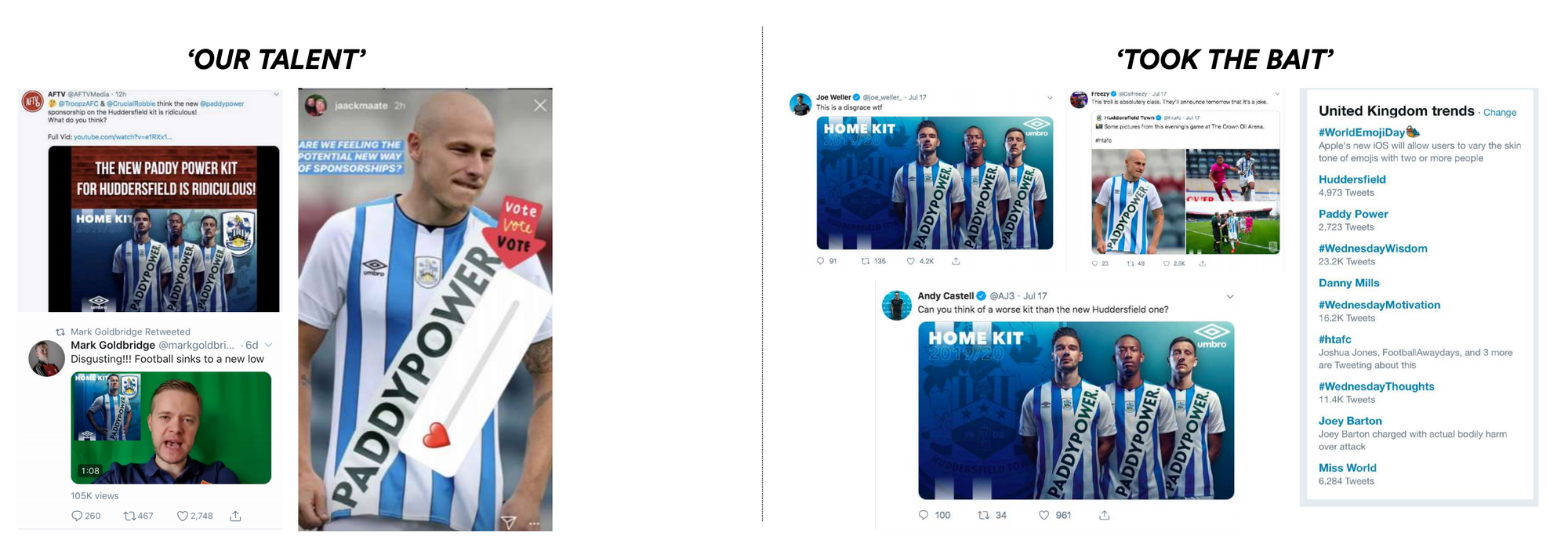 Two days after the friendly, Paddy Power revealed the real ‘unsponsored’ version of the Huddersfield shirt to football fans that had been fuelled by our squad of social accounts into becoming outraged by a football shirt. The same creators and curators that initially brought this news to the attention of football fans, were encouraging fans to talk about the reveal of the real Huddersfield shirt for the 2019/2020 season.