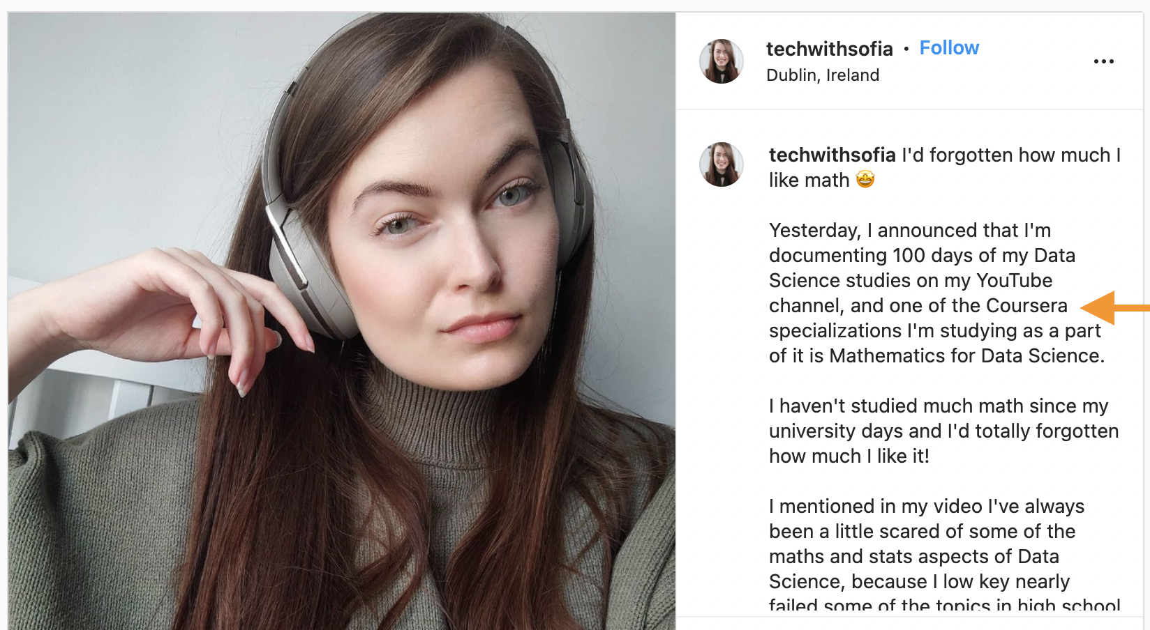 The Instagram post of techwithsofIa is a very good advertising example. The conventionally beautiful woman shows off her astonishing work with Coursera. The photo is simultaneously bright and attention-catching, and also very intriguing. The first line about an interesting project makes the audience open the photo and learn more about Sofia’s 100 days of Data Science vlog, getting more mentions about the Coursera courses. The comments are also supporting the theme, rising the post in the Instagram feed. The theme of young women in STEM is always discussed a lot, so the combination of photo and text is very successful for comment generation.