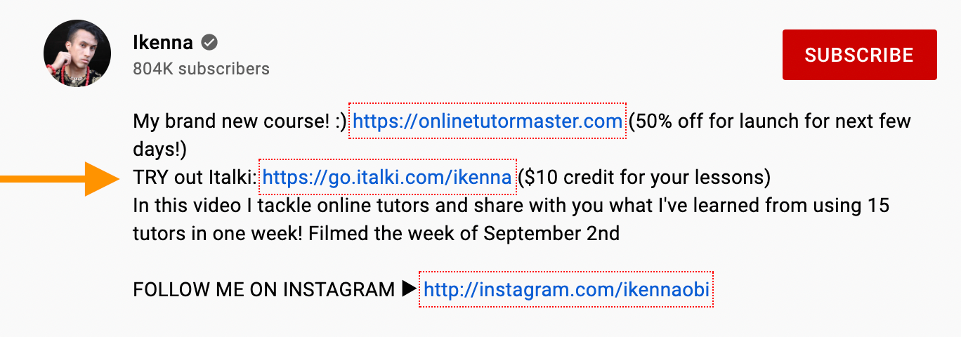 There are also all the links in the description below the video. Unlike the previous example, they are personalised links with discounts. The video author doesn’t hide that he will benefit from the subscriptions, so this is a very honest advertisement. Many people value this honesty and will use Ikenna’s link as a way to say “thank you” for his work and entertaining videos.