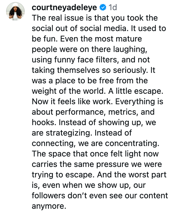“Flattering imagery is cheap to produce and boring to consume. People want content that feels real. Savvy creators are leaning into unproduced, unflattering images. In a world where everything can be perfected, imperfection becomes a signal.”