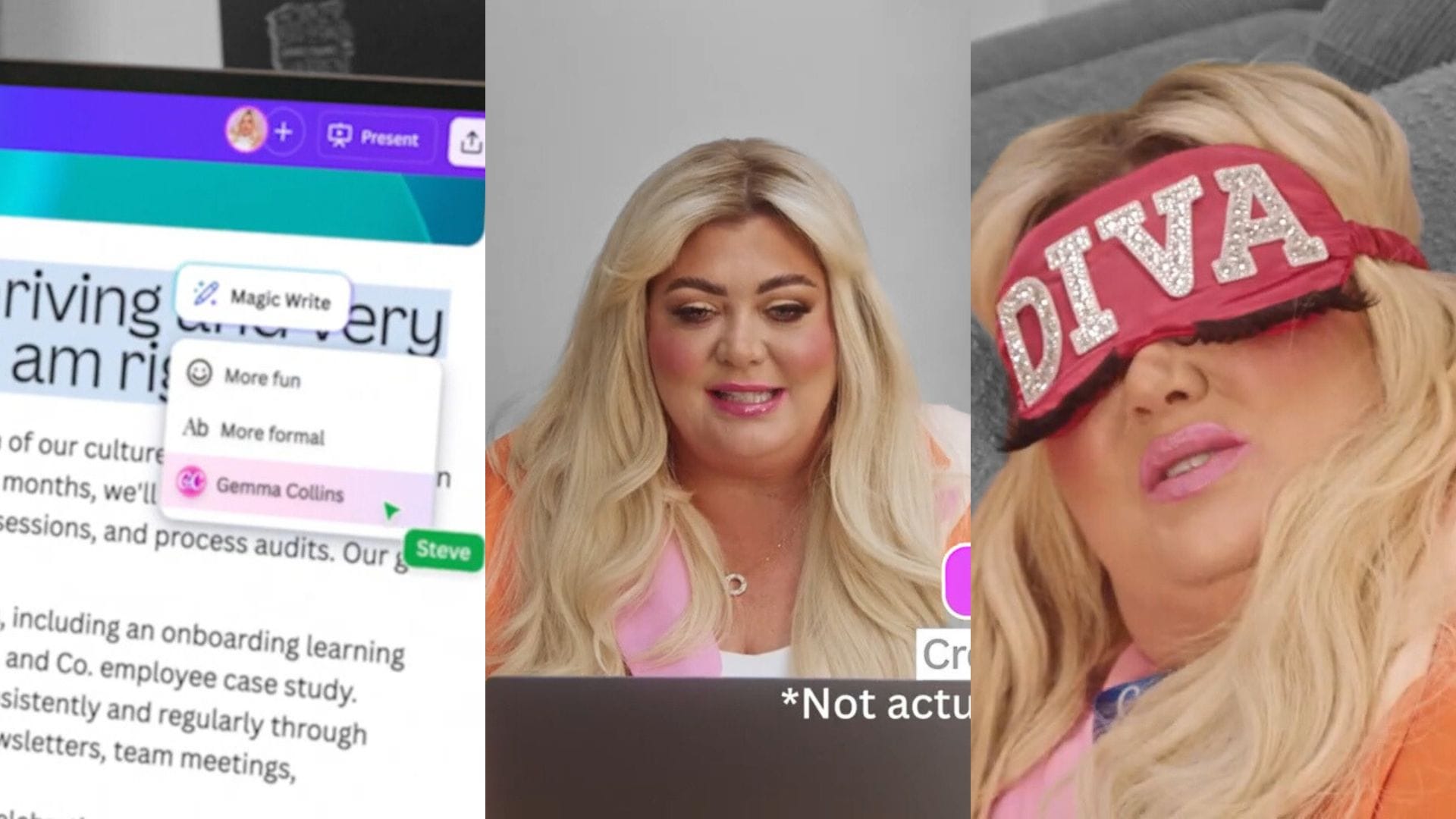 The activation goes so far beyond just another celebrity cameo and extends directly into the product experience. Canva has introduced a limited-edition “Gemma Collins” tone of voice inside its Magic Write tool, and a collection of campaign-inspired templates. The result is a campaign that turns the magic of Gemma Collins into shareable, marketable assets.